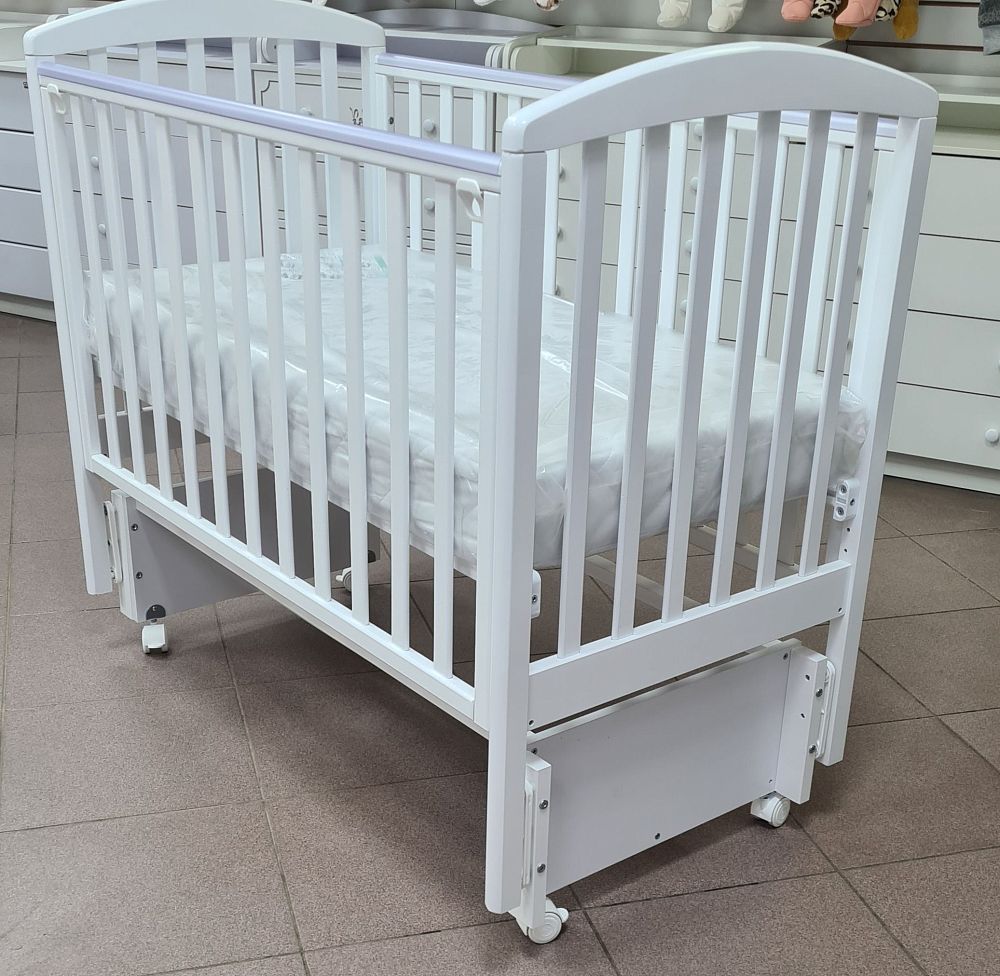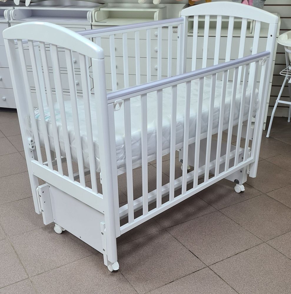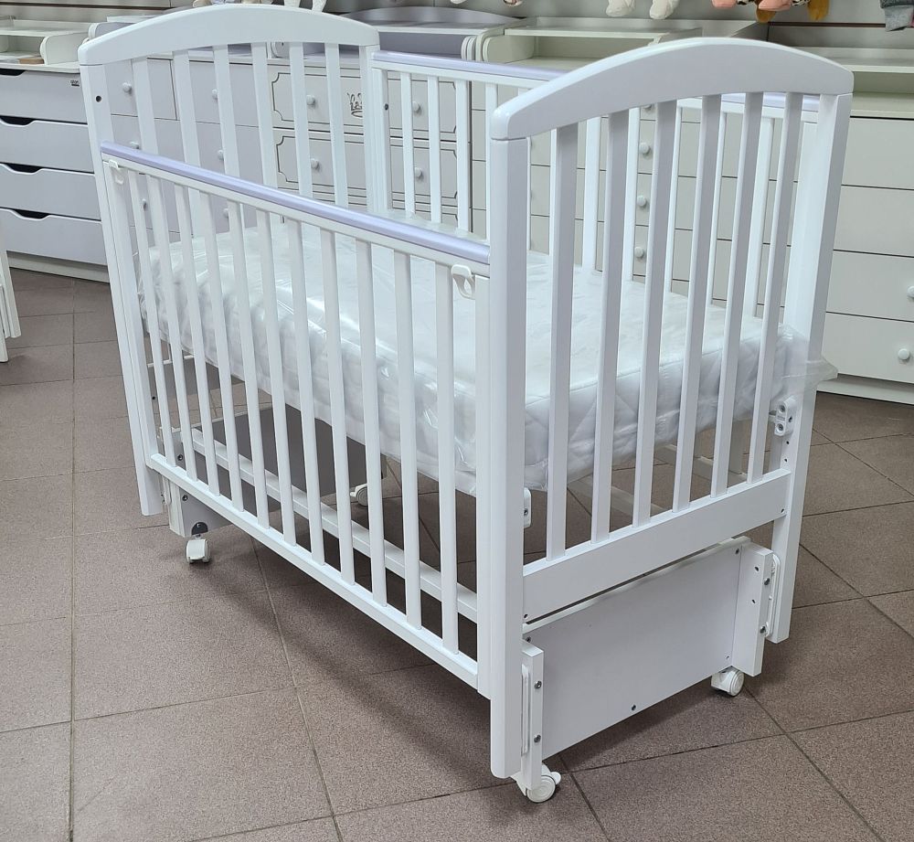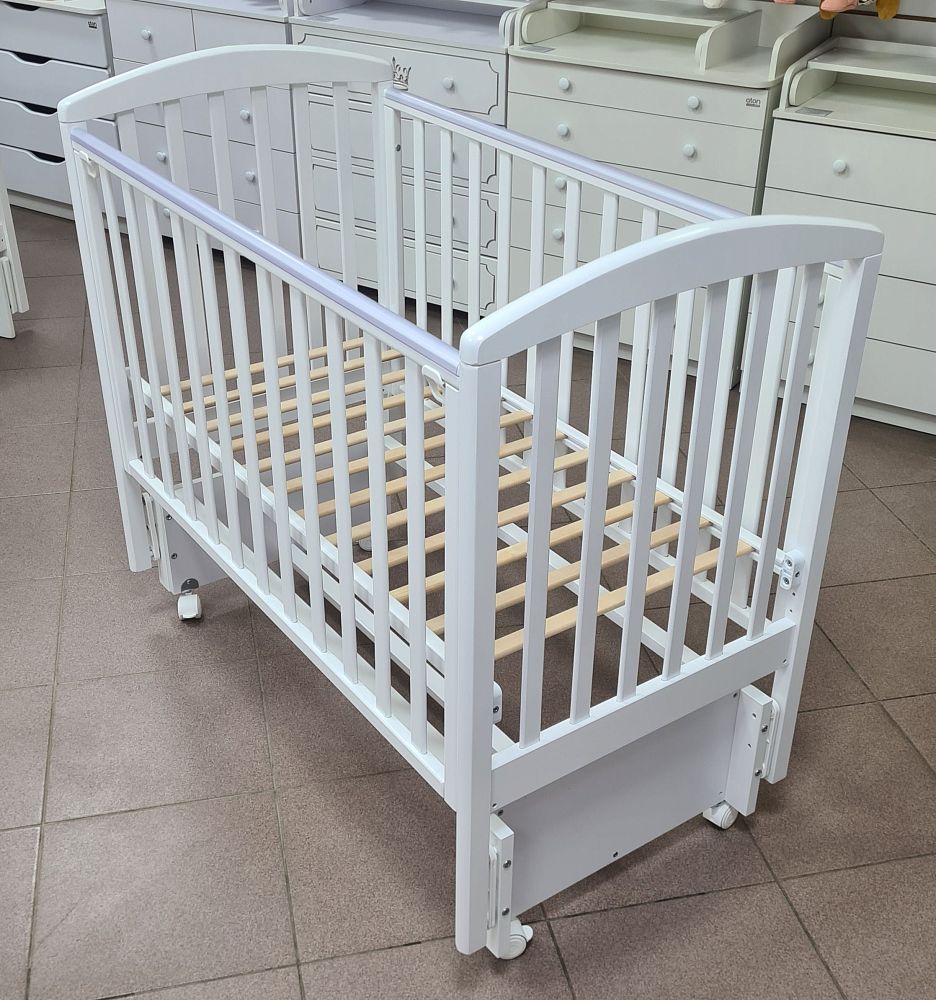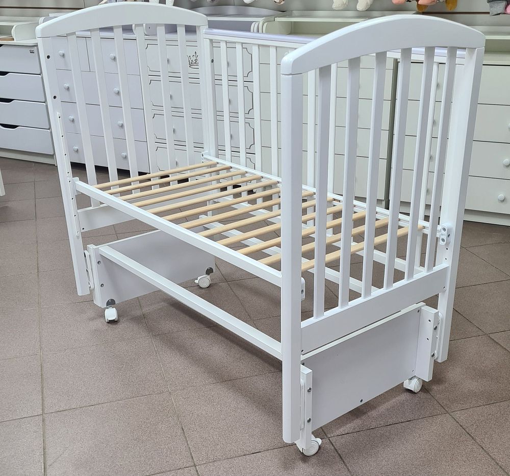 Передняя стенка кроватки опускаемая, для более удобного доступа мамы к ребенку, а так же ее можно снять и использовать как прикроватный вариант или сделать из кроватки диванчик для малыша.