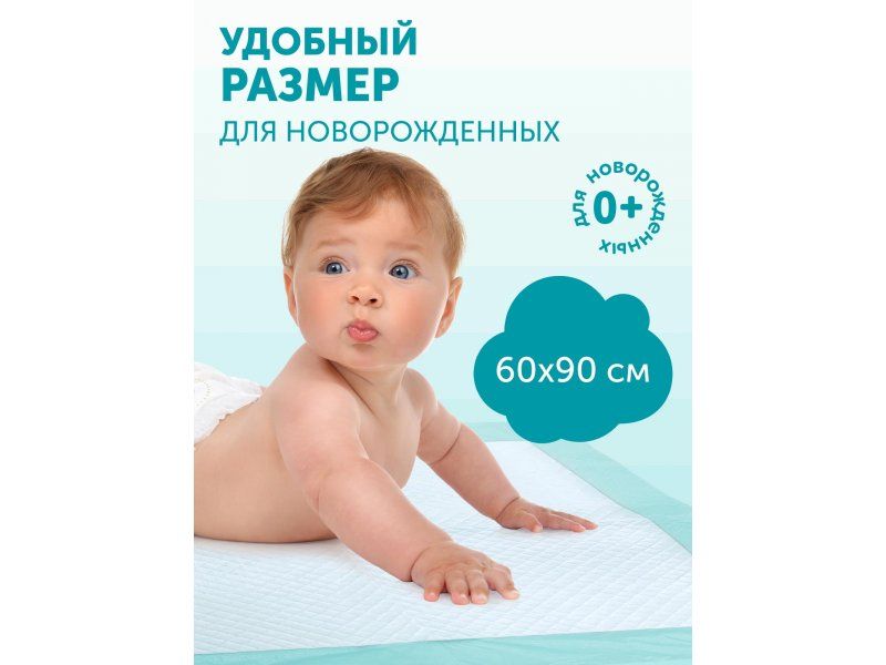 Влагонепроницаемый слой препятствует скольжению по поверхности матраца, манежа, пеленального столика, во время проведения массажа и медицинских процедур. Удобный размер пеленки 60 см х 90 см позволяет использовать ее как для самых маленьких детишек так и для малышей постарше.